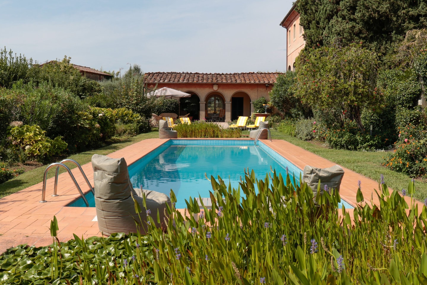 Outside, the private landscaped park frames multiple spots for dining beneath Tuscan skies. The 20-by-4-metre pool occupies its own secluded corner, surrounded by sun loungers and parasols. A pool house contains everything needed for long afternoons by the water, including a bathroom, changing facilities and a small kitchen. The property sits entirely enclosed, offering complete privacy whilst panoramic views stretch across the Lucca countryside.