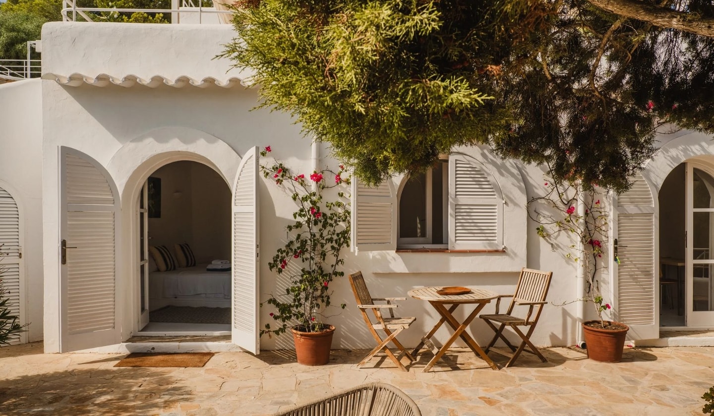 Cala Jondal beach lies just minutes away, home to Blue Marlin and Tropicana beach clubs. The smaller, quieter Sa Caleta offers an alternative ten minutes by car. Despite this proximity to Ibiza's famous beach scene, the villa maintains complete privacy on its mountain perch. Ibiza Town and the airport are both within a fifteen-minute drive, making arrivals simple and day trips effortless. Two bedrooms feature private terraces where morning coffee comes with uninterrupted views across the Mediterranean towards Es Cubells.