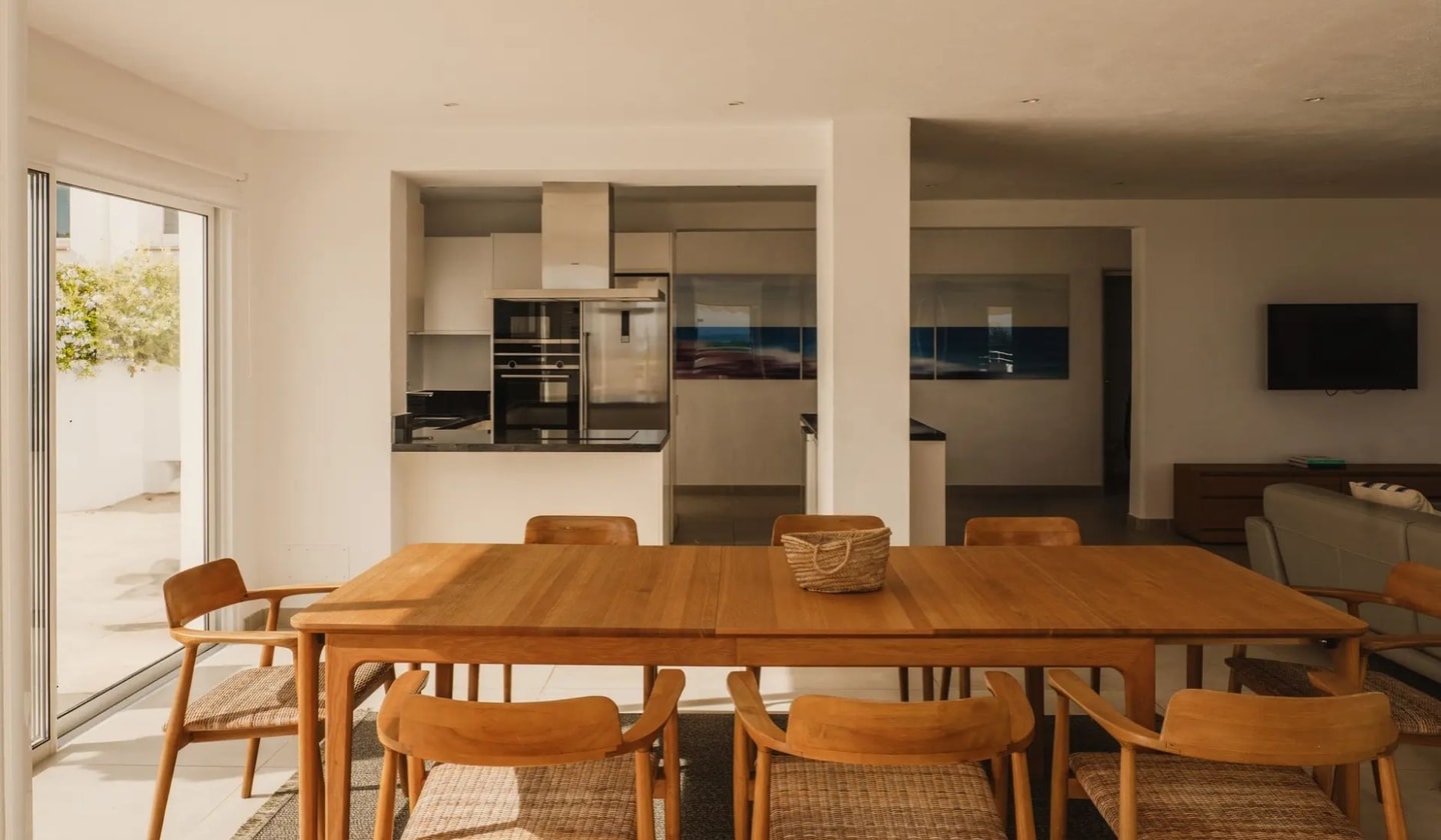 French design sensibilities shine throughout the villa, where modern pieces sit alongside vintage finds to create a distinctive aesthetic. The main living area opens directly onto the pool terrace through wide patio doors, bringing those remarkable sea views deep into the heart of the home. Eight bedrooms spread across the property, each with its own en-suite bathroom. Five feature double beds while three offer twin configurations that convert easily. The main house holds five bedrooms, with additional accommodation in a guest house, casita and studio below.