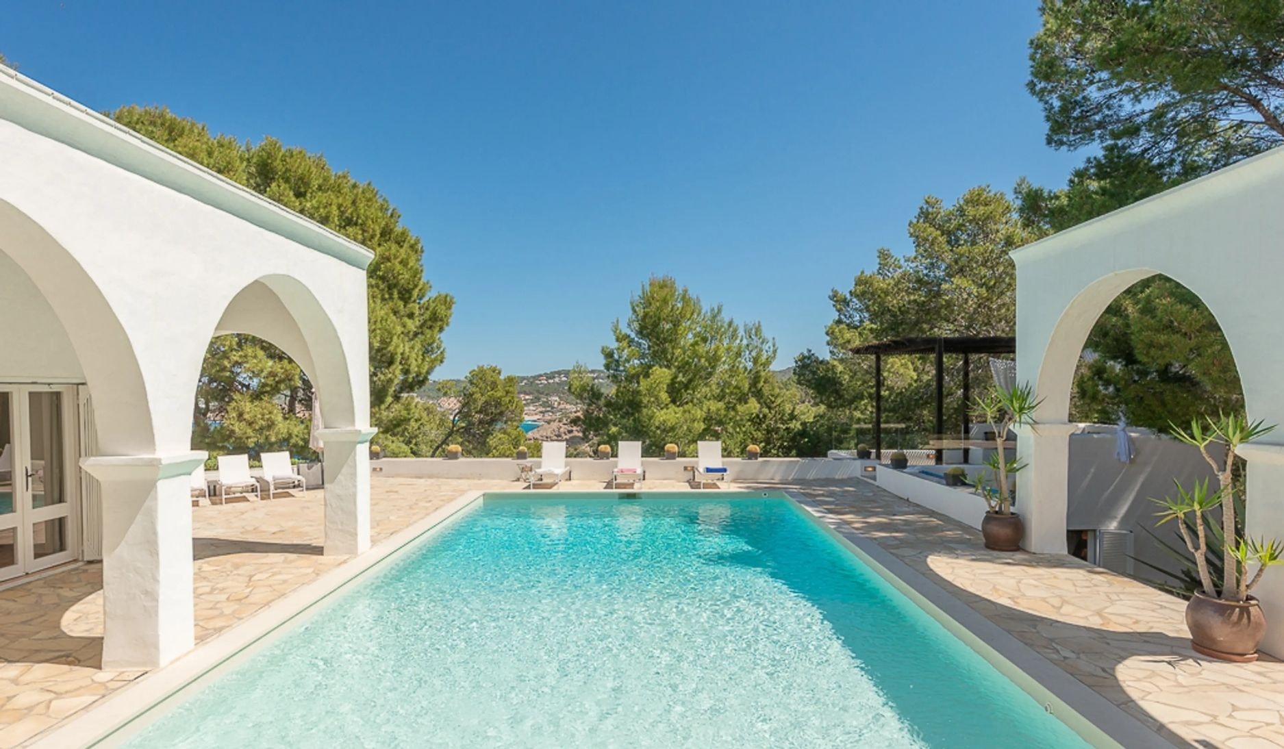 A west coast Ibiza hideaway with six bedrooms spread across hectare grounds. Fresh interiors, private bay access, and those famous island sunsets from every angle.