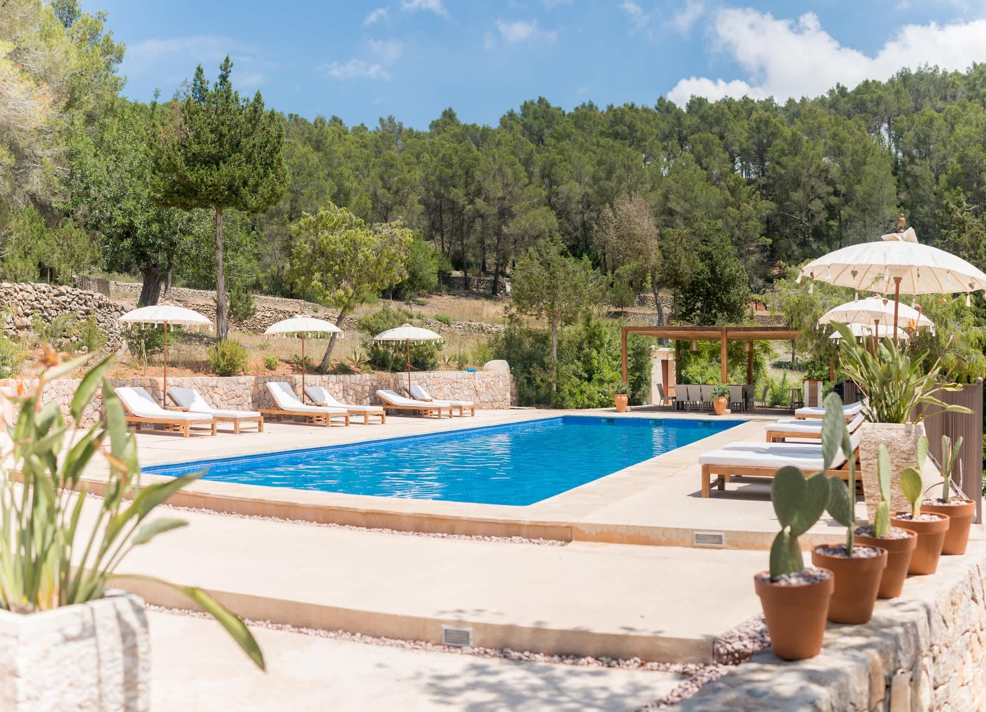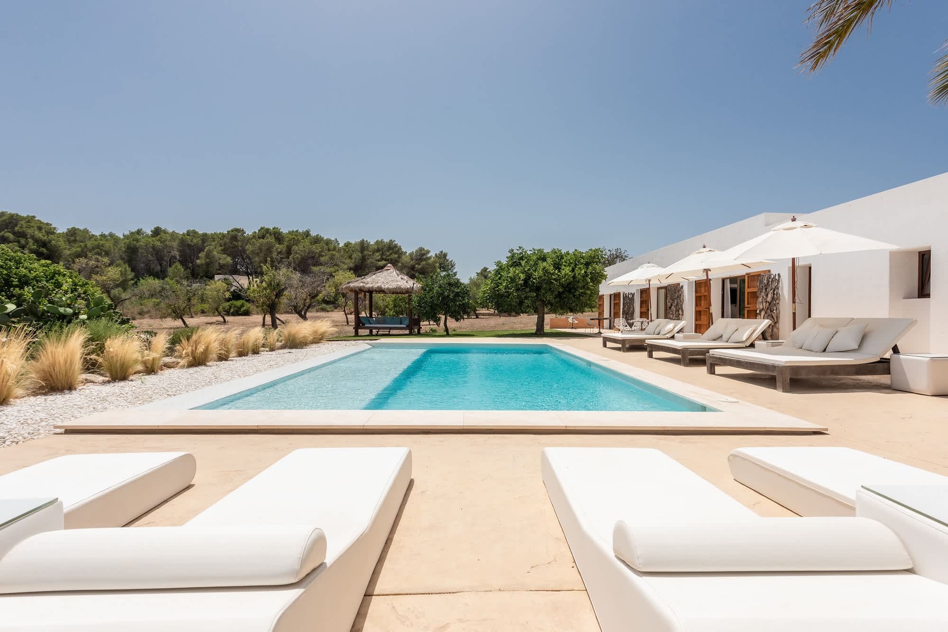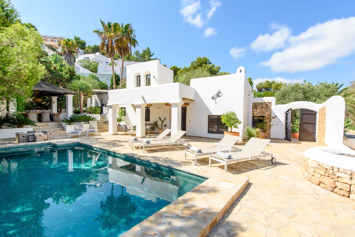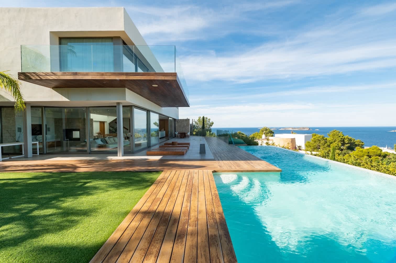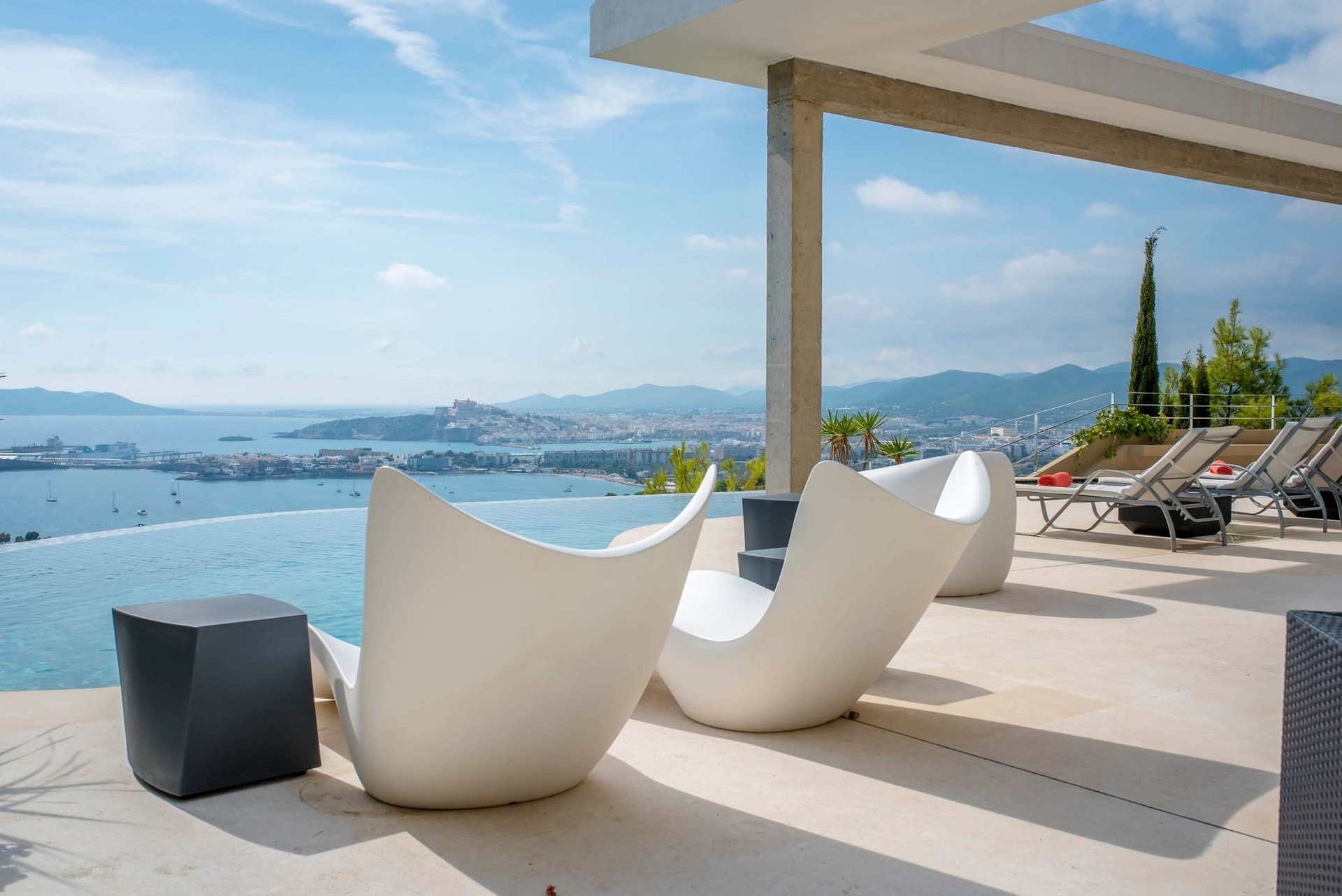 - Floor-to-ceiling windows frame Ibiza's landscape
